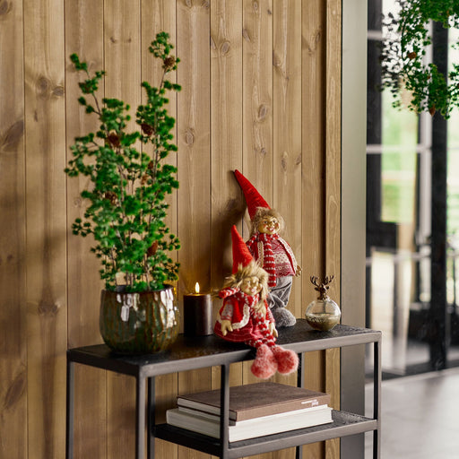 En sjarmerende, sittende nissejente som skaper den gode julestemningen. Hun er håndlaget med fine detaljer. Klær i klassisk nordisk stil og hender og ansikt i polyresin materiale som gir et uttrykksfullt og varig preg. Perfekt til å pynte med på en hylle, i vinduskarmen eller sammen med andre julefigurer. Ønsker du et komplett nissepar, finnes det også en matchende Santa nissegutt.
