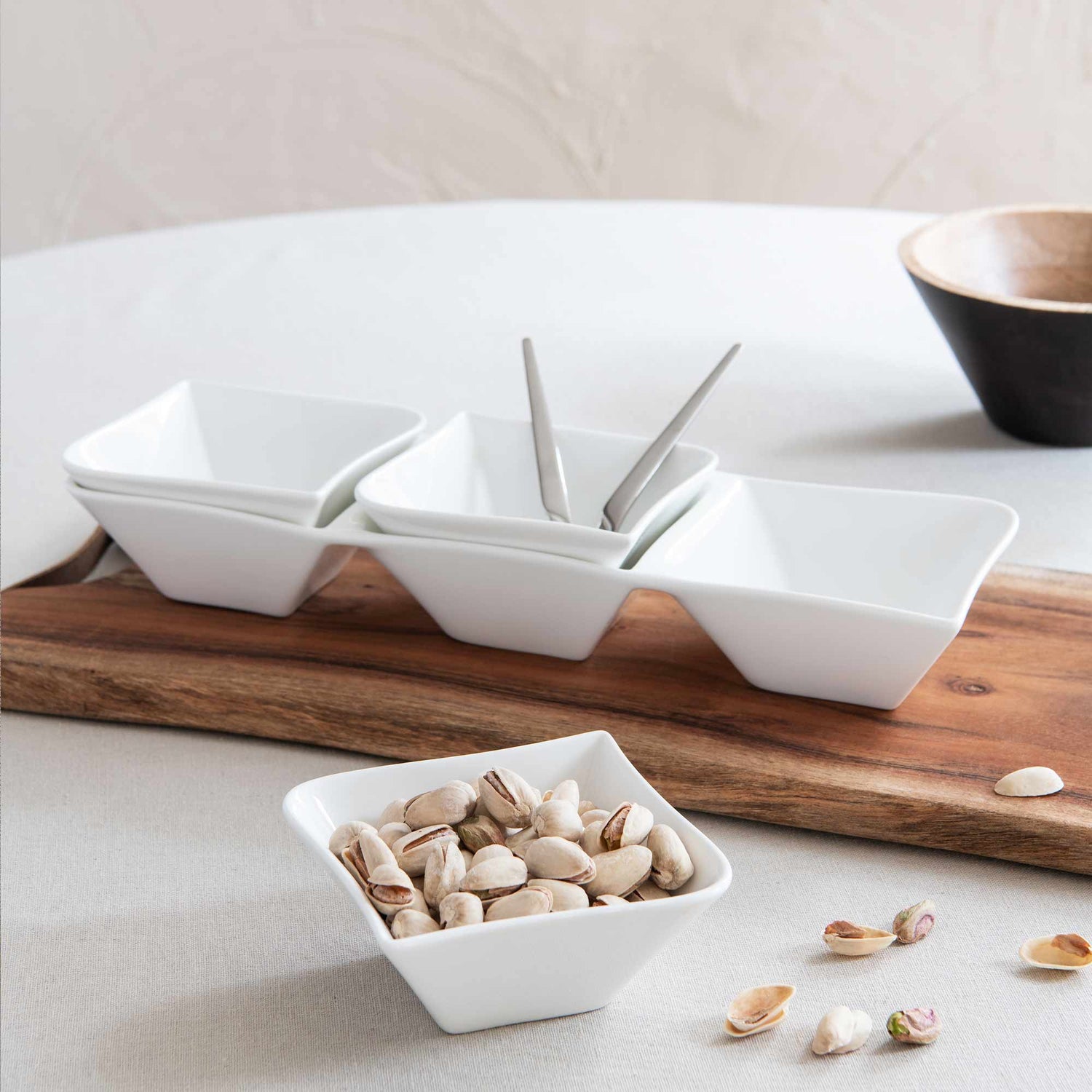 Dette settet består av én tredelt serveringsskål og tre tilhørende små skåler – perfekt til tapas, taco, snacks, sauser, småretter eller desserter. Skålene er både dekorative og funksjonelle.