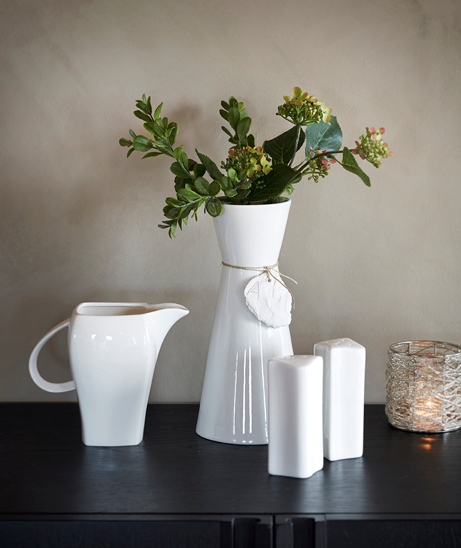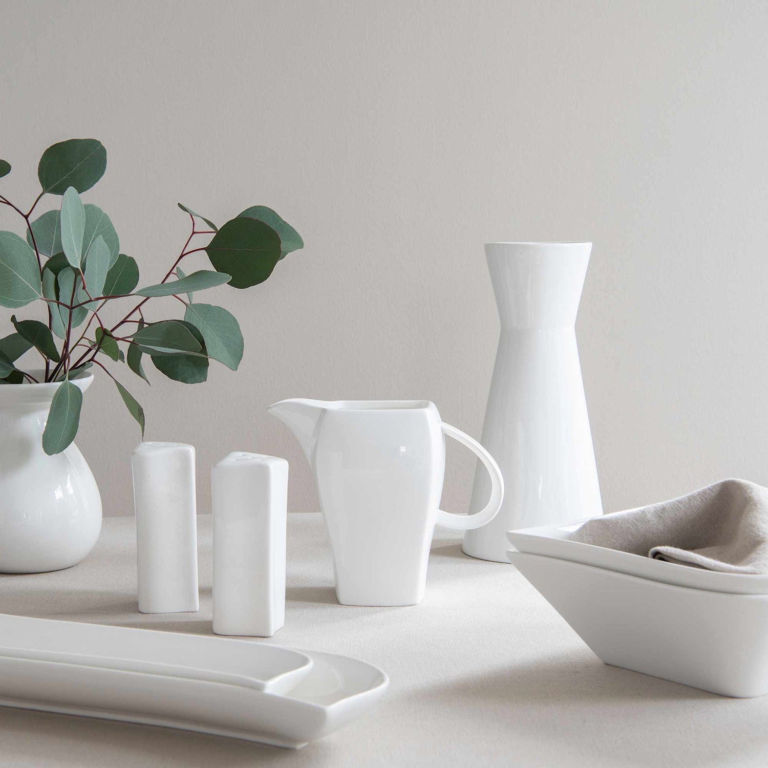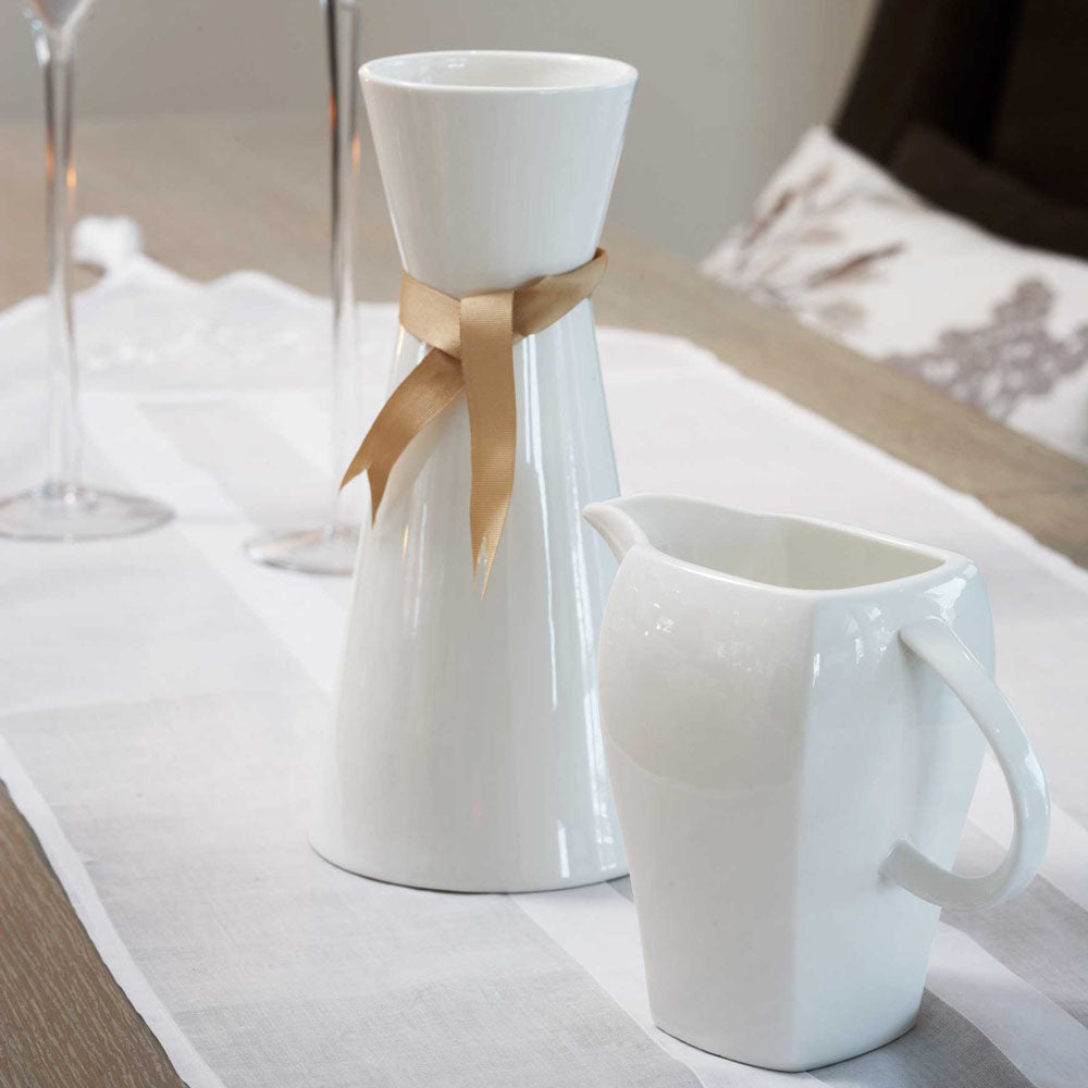 Denne hvite porselenskaraffelen fra Hvit Lilje-serien kombinerer funksjon og eleganse på en perfekt måte. Det rene og moderne uttrykket gjør den like fin på et dekket festbord som til hverdagsbruk.