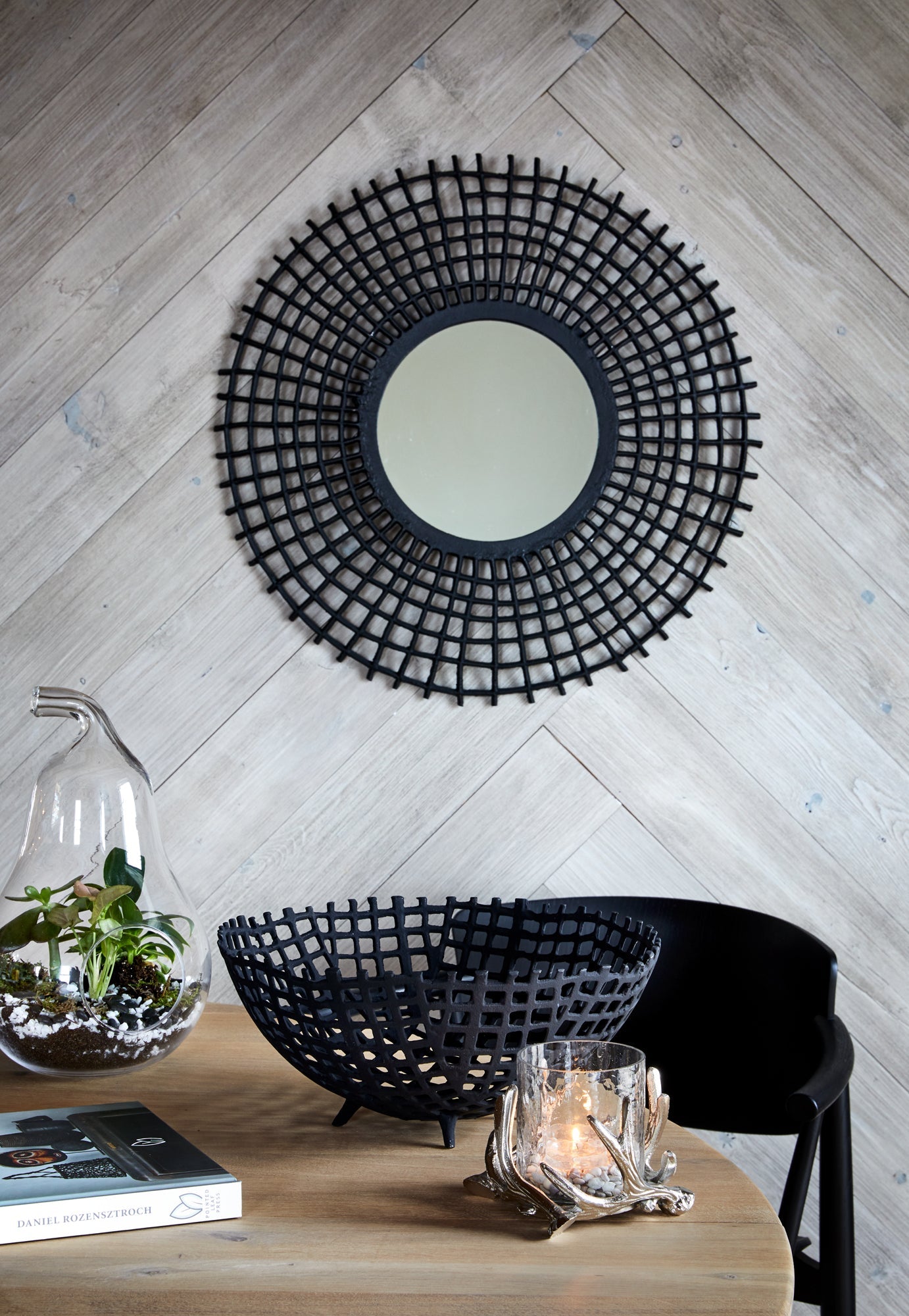 Dette stilige speilet blir virkelig et blikkfang på veggen enten det henger i gangen, stuen, på badet eller på soverommet. Sierra speil er håndlaget i aluminium og har svart finish. Passer utmerket sammen med de andre produktene i denne serien: Sierra bolle, fat og dekorkule.