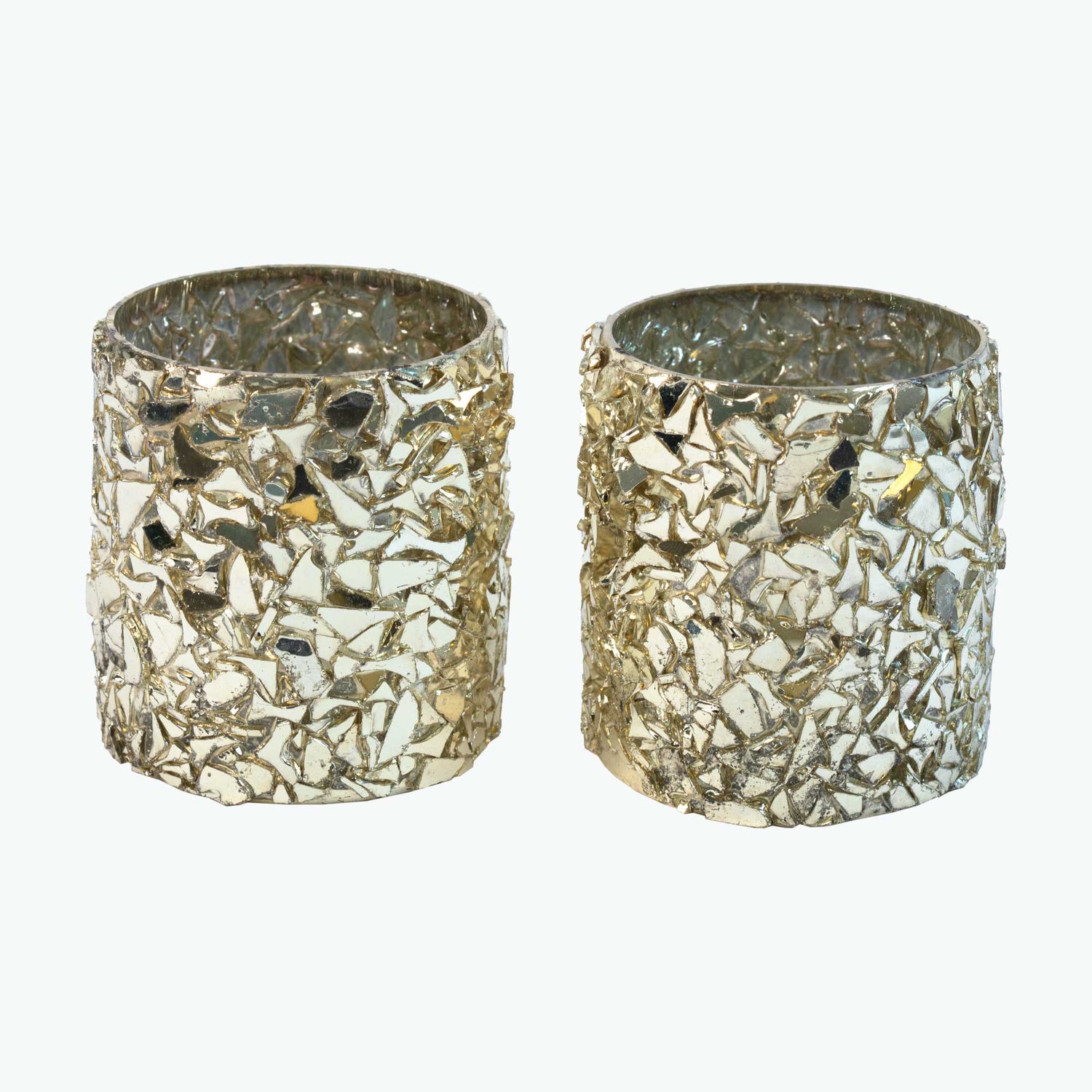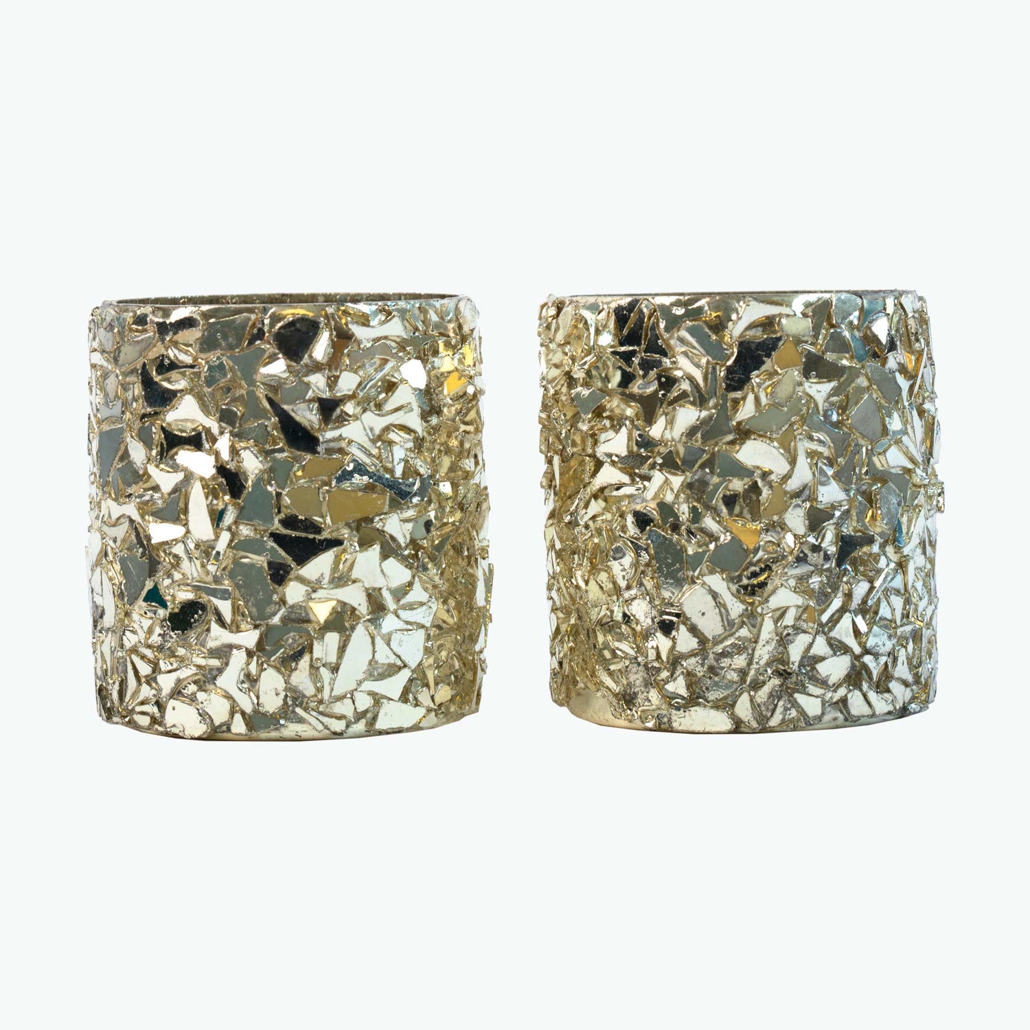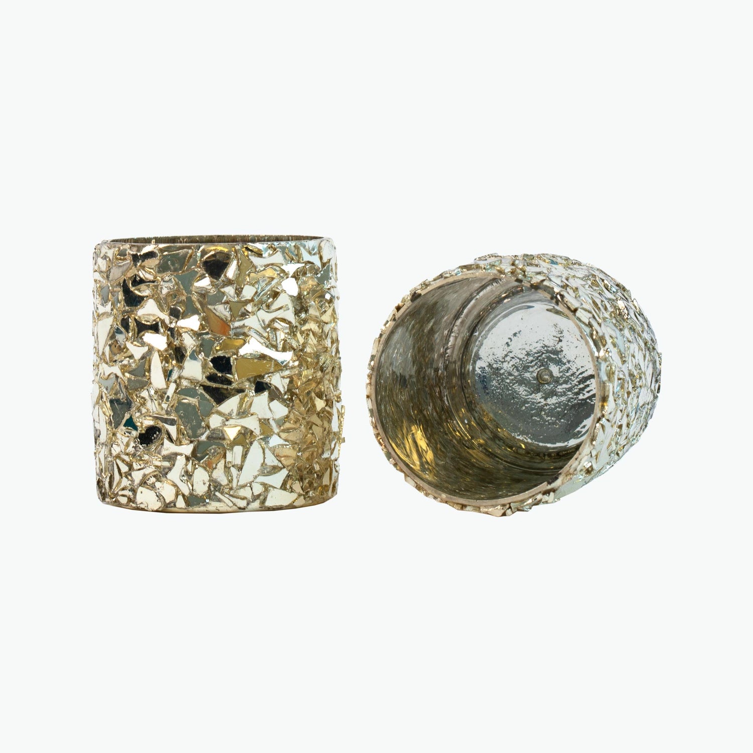 Glitrende flotte telysholdere som gir et gyllent og stemningsfullt lys. Telysholderne er håndlagde og dekorerte med speilglassbiter.