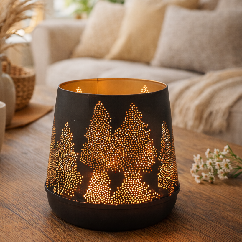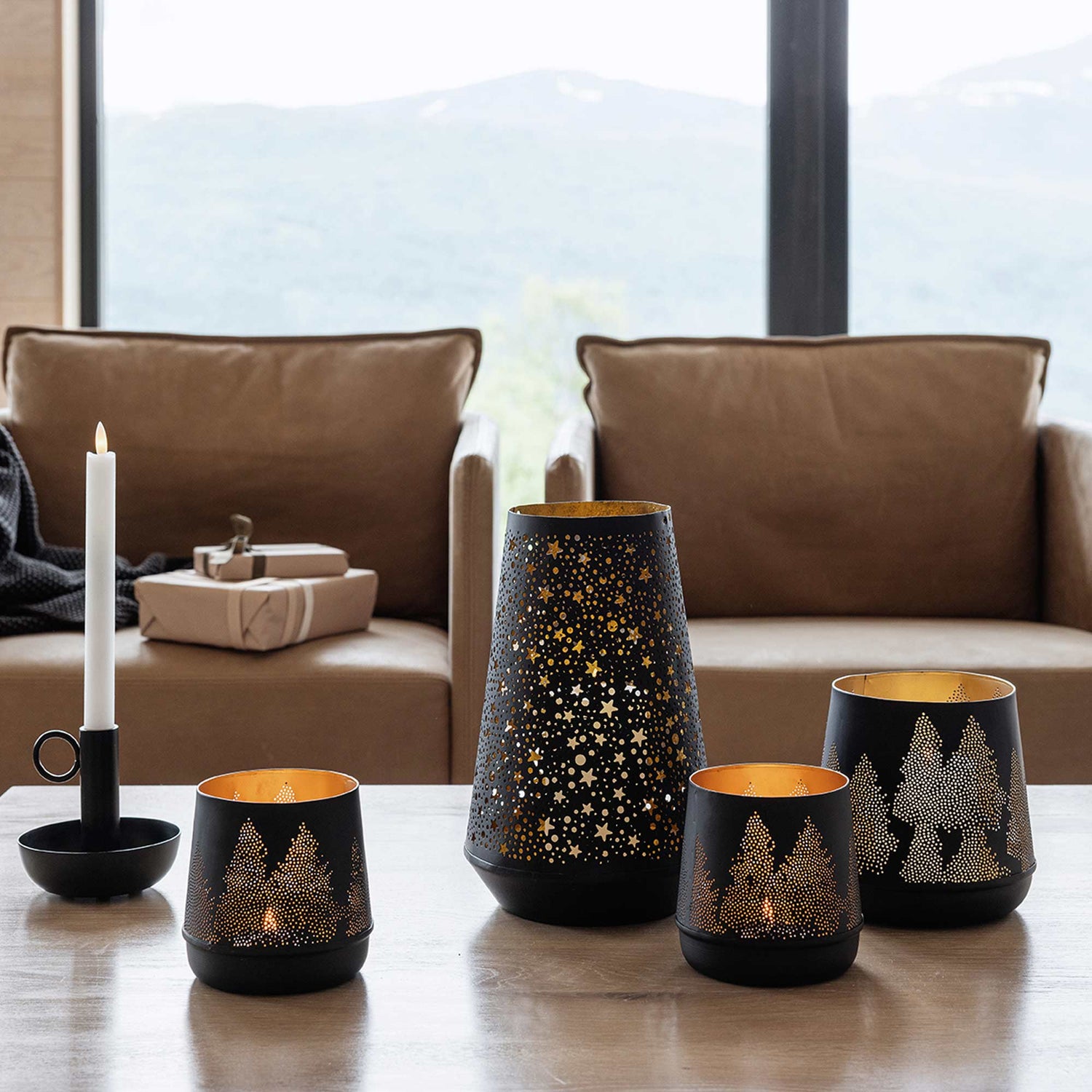 Håndlaget lykt i jern med matt, sort finish på utsiden og gullfinish på innsiden. Dekorasjonen består av mange små hull som til sammen danner formen av trær, og gir et unikt og vakkert lysskinn. Bruk den gjerne sammen med våre Ambience kubbelys eller Glow lyslenke. Noelle lykt passer godt hele året, men er ekstra fin til jul.