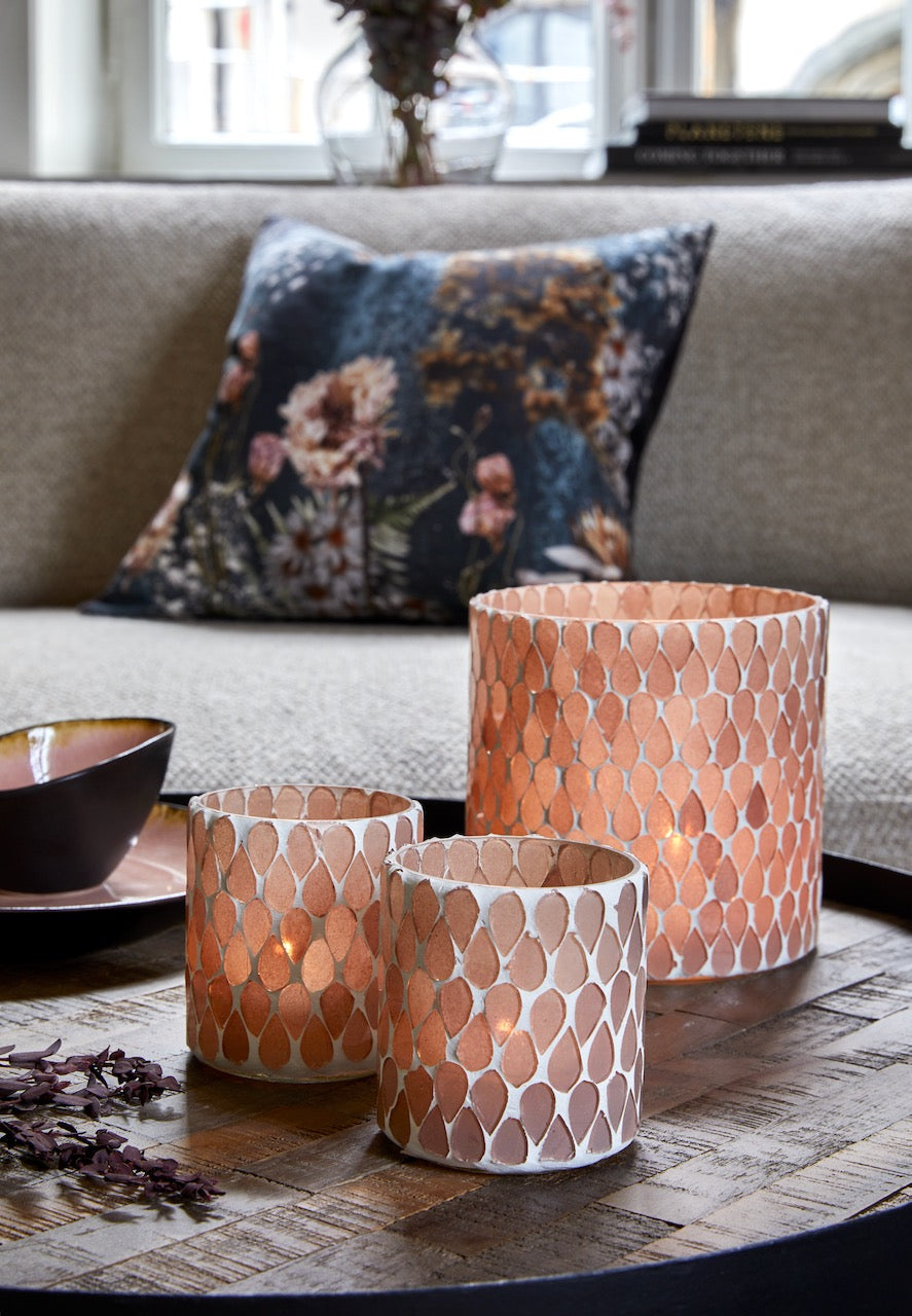 Skjønn lykt som er dekorert med rosa glassmosaikk som gir et nydelig fargespill. Først munnblåses glasset, deretter legges den vakre mosaikken på for hånd. Rosalin lykt kan også gjerne brukes som vase.