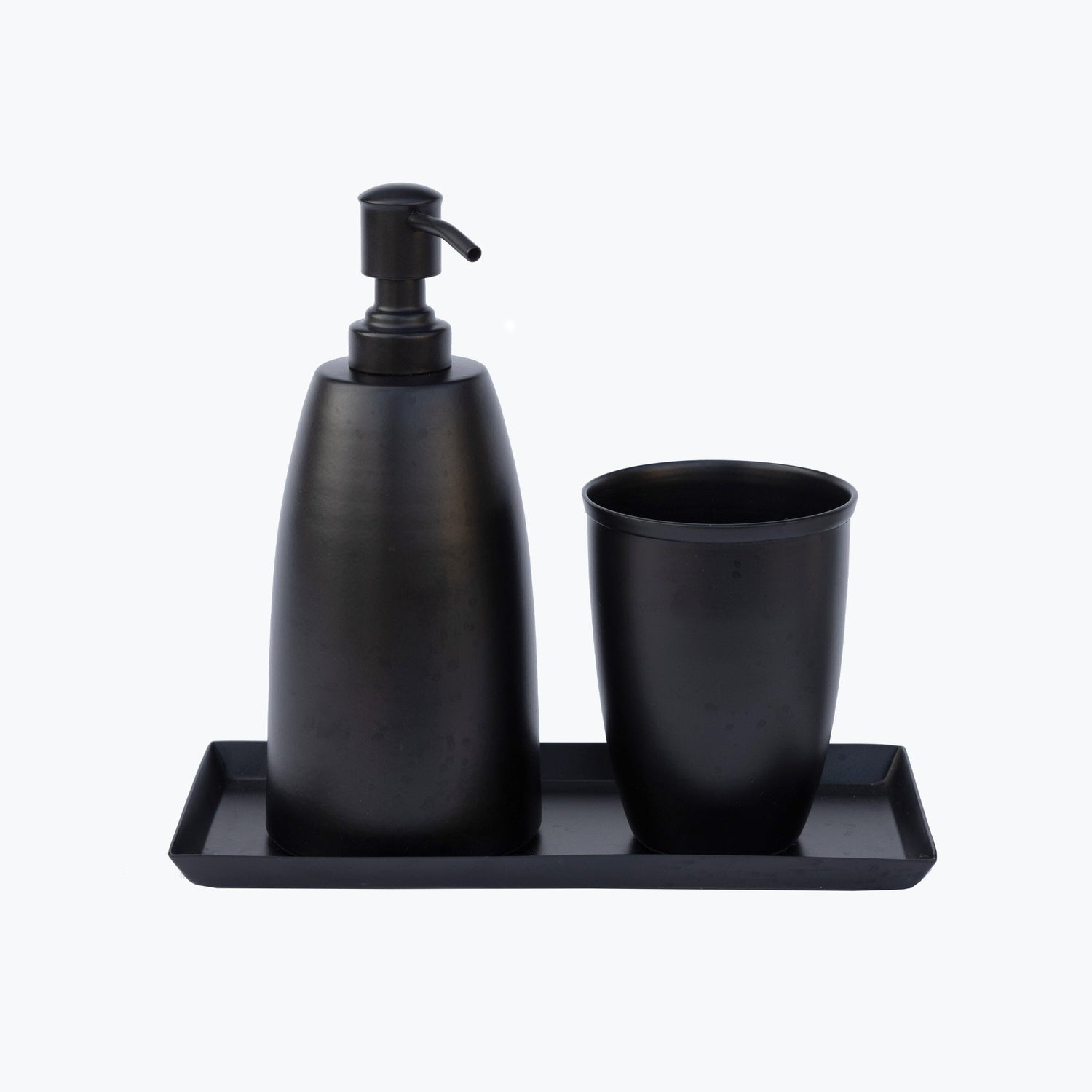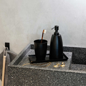 Gi ditt baderom et snev tidløs eleganse med vårt håndlagde baderomssett i rustfritt stål, perfekt for de som setter pris på både funksjonalitet og estetikk. Dette settet er i 3 deler. Mål: Dispenser 300 ml H21 Ø8,5 cm Krus 450 ml H11,5 Ø8 cm Brett 11x23 cm