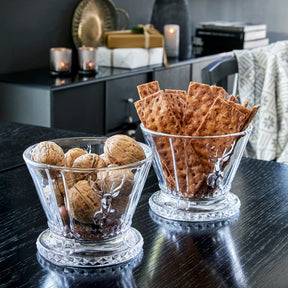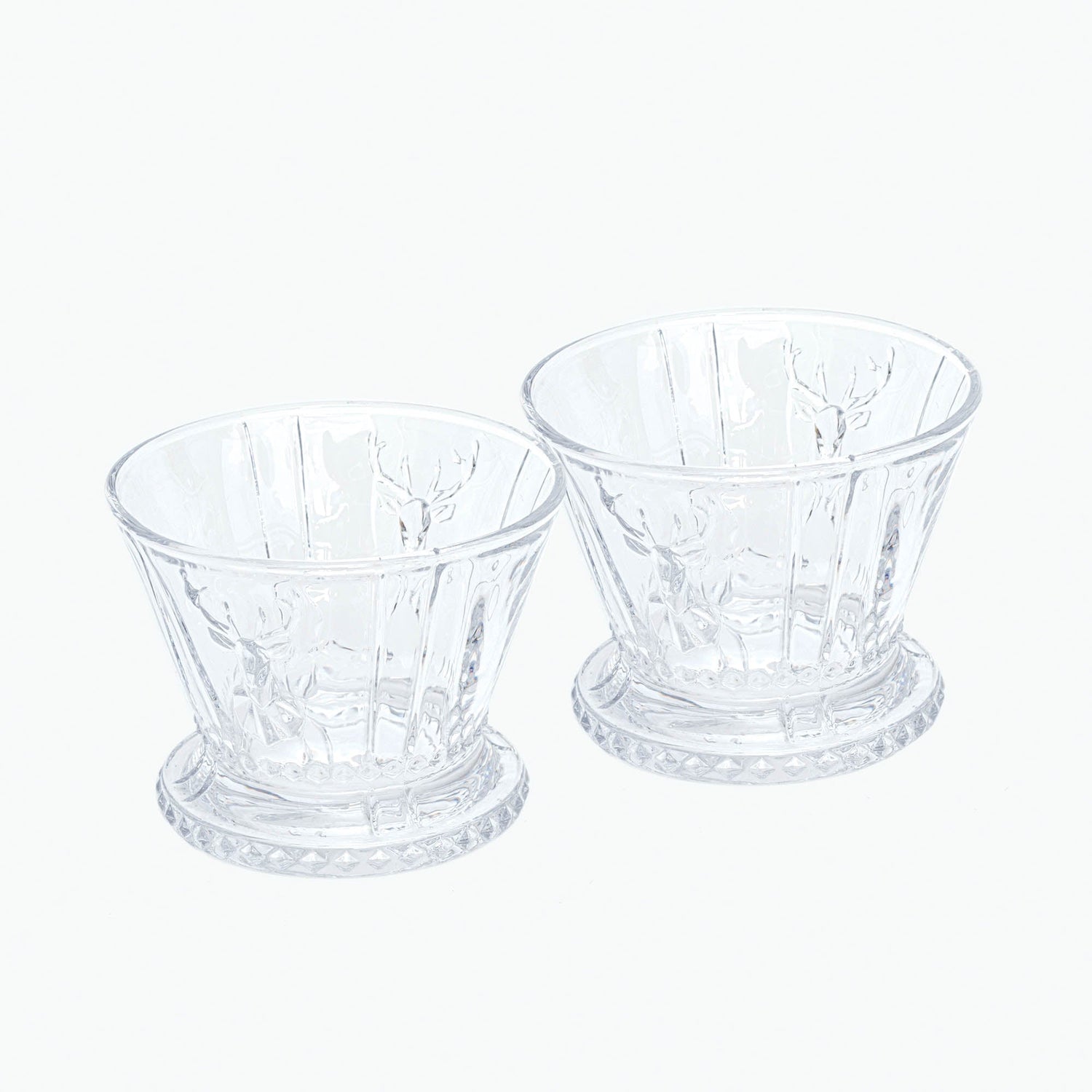 Nydelige skåler laget i pressglass med hjortemotiv og andre flotte detaljer. Skålene passer utmerket til servering av snacks eller til små blomsterdekorasjoner.