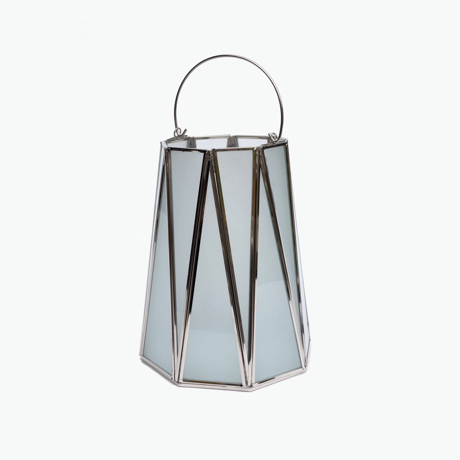 Denne tidløse lykten er utformet i metall med en nikkelfinish og hvitt glass som gir rommet en varm følelse. Mål: H24 Ø19 cm