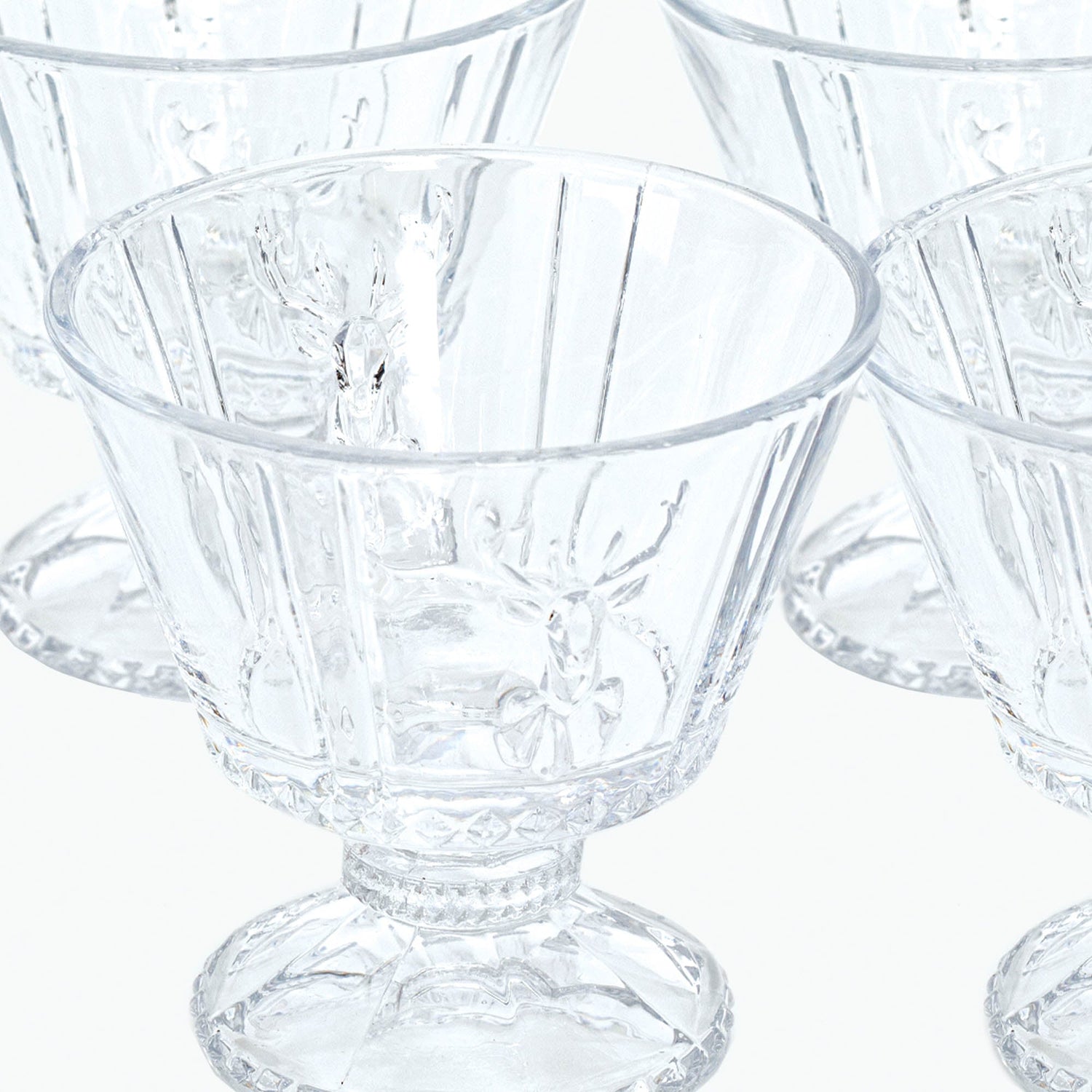 Beautiful dessert bowls made of pressed glass with a deer motif and other lovely details. In addition to desserts, the bowls are perfect for tea lights, dips, candy, and small floral arrangements.