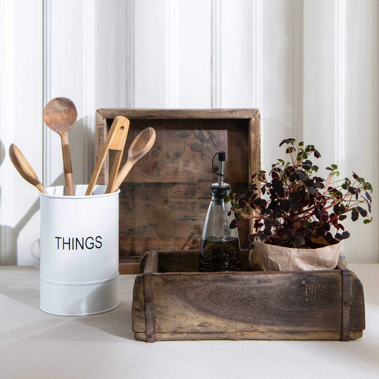 Stylish storage box made from recycled wood. The box can be used in all rooms of the house: in the bathroom for soaps and creams, in the kitchen for herbs, oils, ketchup and mustard bottles, in the living room for flowers (in a sealed container), in the bedroom for hair accessories or jewellery. Fun fact: this box was originally a brick mould.