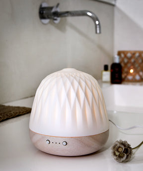 Skap din egen velduftende oase med Mia diffuser. Velg mellom 5 ulike eteriske oljer som er laget av naturlige og økologiske ingredienser (duftene kjøpes utenom). Diffuseren kan brukes i alle rom og er et flott innslag i interiøret. Mia har ulike damp-, tids og lysinstillinger som du kan velge etter ønske og humør. Basen er laget i lyst gummitre og toppen er i porselen. Diffuseren kobles til strøm.