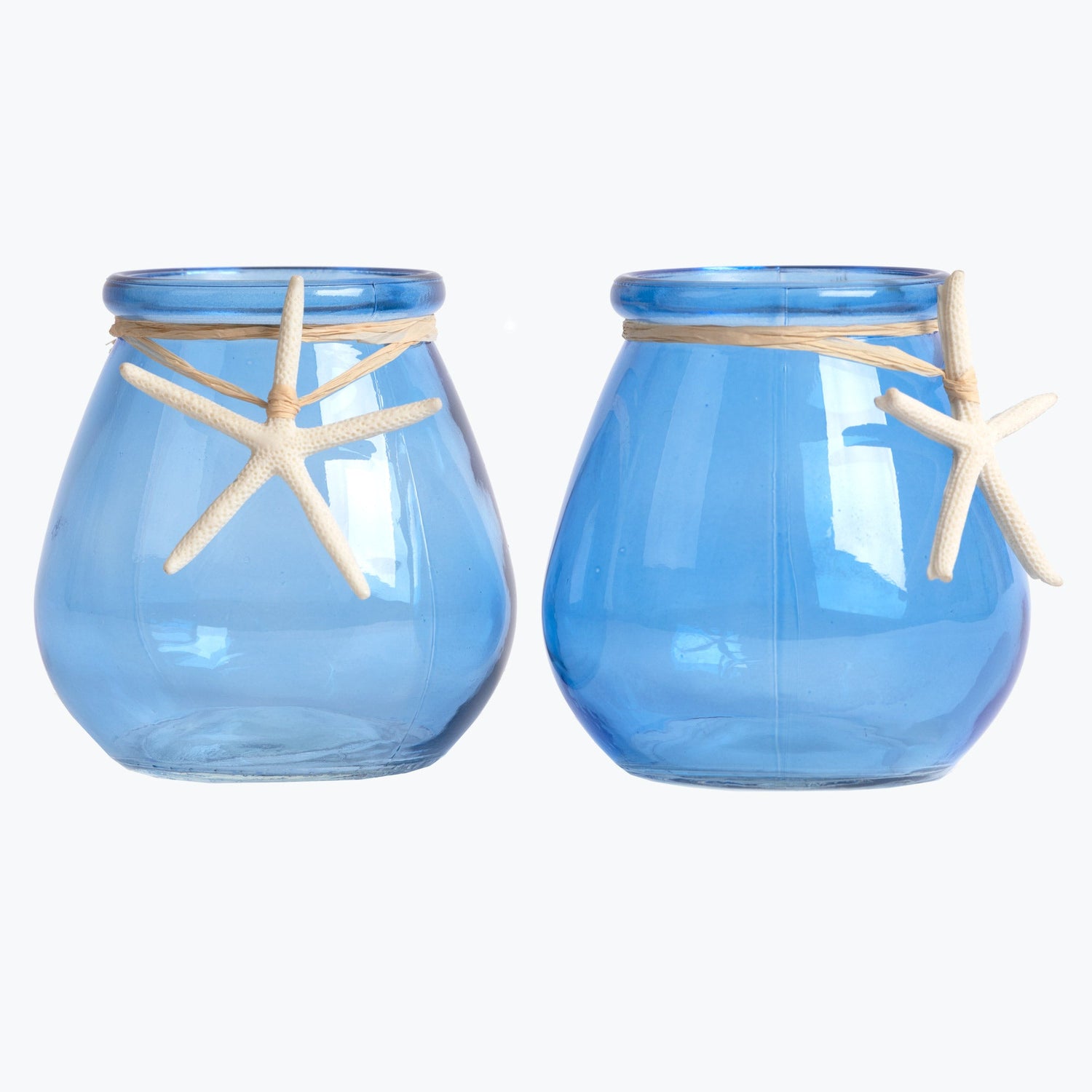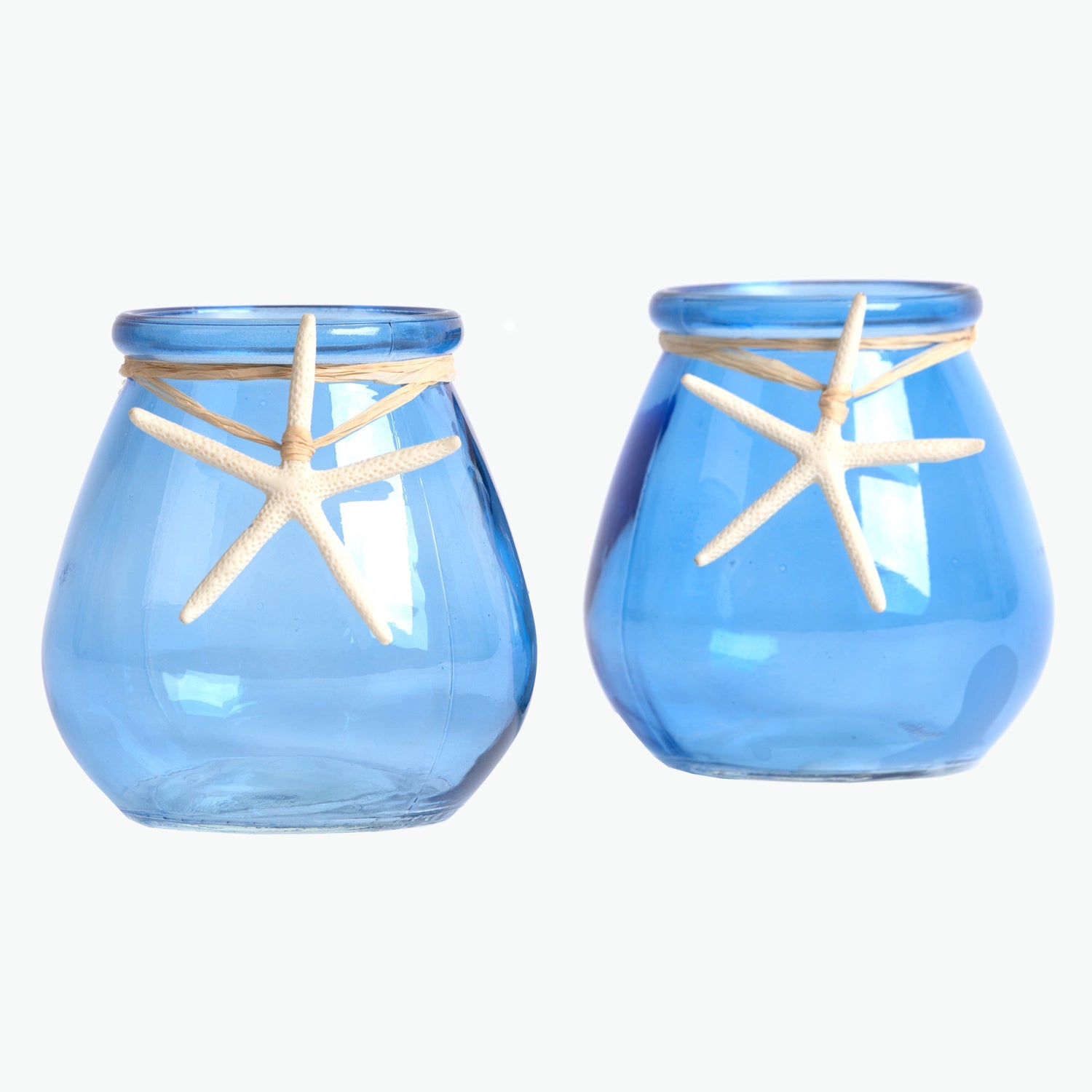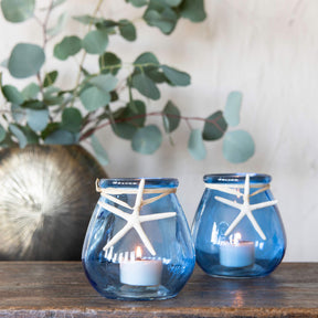 Sommerlige og stemningsfulle telysholdere i resirkulert blått glass med en dekorstjerne som er festet med strå.